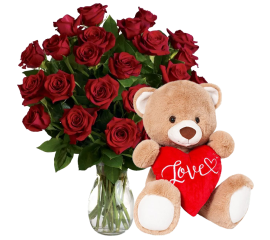 Buchet de flori cu 25 trandafiri roșii, vază și Ursuleț de plus „Valentine” 30 cm Un cadou care spune „Te iubesc” fără cuvinte — buchetul cu 25 de trandafiri roșii , aranjați cu grijă într-o vază elegantă , este completat perfect de un ursuleț de plus „Valentine” de 30 cm,...