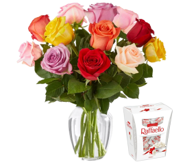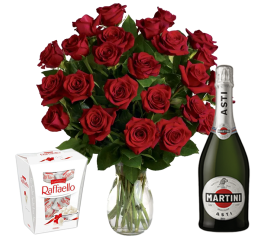 Buchet de flori cu 25 trandafiri, Praline Raffaello 230g, Martini Asti și vază Un cadou ce îmbină armonios eleganța florilor, dulceața rafinată a pralinelor și bucuria sărbătorii. Buchetul cu 25 de trandafiri proaspeți este expresia perfectă a dragostei și pasiunii, completat de...