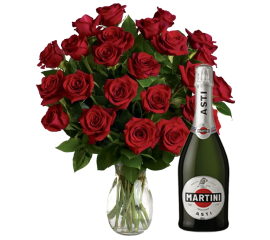 Buchet de flori cu 25 trandafiri roșii, vază, Ursuleț de plus „Valentine” 30 cm și sticlă Martini Asti Un cadou premium care îmbină rafinamentul, pasiunea și romantismul într-un singur aranjament: 25 de trandafiri roșii , așezați cu eleganță într-o vază de sticlă , alături de un...
