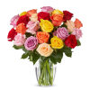 Buchet de flori cu 25 trandafiri multicolor si vaza