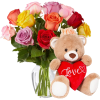 Buchet „Vibrant Love” cu 15 trandafiri si vaza si Ursuleț de plus