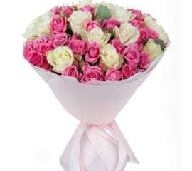 Un aranjament spectaculos, alcătuit din 51 de trandafiri în nuanțe delicate de alb și roz , ce îmbină eleganța purității cu frumusețea gingașă a romantismului. Trandafirii albi transmit sinceritate, respect și noblețe, iar cei roz adaugă un strop de tandrețe, recunoștință și afecțiune....