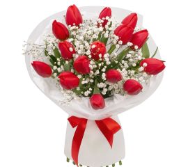 Acest buchet de flori combină 10 lalele roșii și 5 trandafiri roșii, creând un aranjament elegant și plin de pasiune, perfect pentru Ziua Îndrăgostiților. Lalelele transmit admirație și frumusețe, iar trandafirii roșii simbolizează dragostea profundă și pasiunea. Decorul atent și prezentarea...