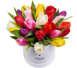 Aranjament Floral cu 25 Lalele Multicolore  Un aranjament floral vesel și plin de viață, realizat din 25 de lalele multicolore proaspete , așezate într-o cutie decorativă de 15 cm , cu materiale florale profesionale care mențin florile hidratate și proaspete mai mult timp. Acest...