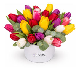 Un aranjament floral elegant și plin de viață, compus din 29 de lalele multicolore atent selecționate, completate armonios de frunze parfumate de eucalipt. Combinația vibrantă de culori transmite energie, prospețime și bucurie, fiind alegerea perfectă pentru a surprinde pe cineva drag sau pentru...