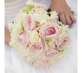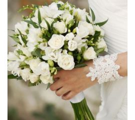 Buchet de mireasă cu trandafiri și frezii albe   Un buchet ce îmbină eleganța clasică cu delicatețea parfumului proaspăt , creat special pentru mireasa care își dorește o combinație de rafinament și naturalețe. Acest aranjament reunește frumusețea sofisticată a 12 trandafiri albi ,...