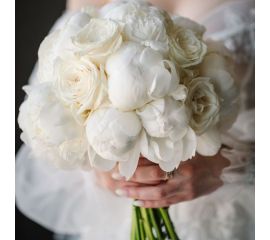 Buchet de mireasă cu trandafiri albi și bujori albi   Un buchet de o frumusețe clasică și atemporală, creat pentru mireasa care își dorește puritate , eleganță și un strop de rafinament. Această capodoperă florală îmbină cu grație 8 trandafiri albi , simbol al iubirii sincere și al...