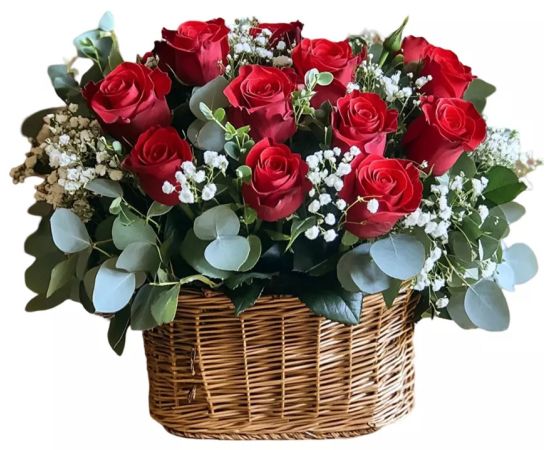 Coș cu flori „La mulți ani” cu 11 trandafiri roșii și gypsophila