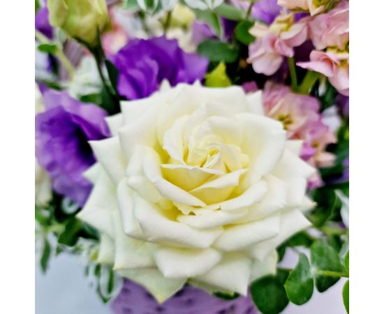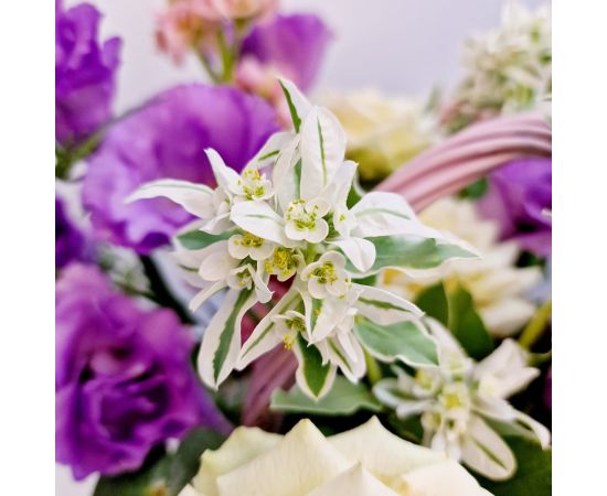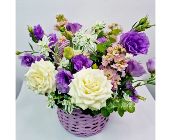 „Grădina Viselor” este un aranjament floral delicat și rafinat, realizat într-un coș elegant, perfect pentru a transmite emoție și frumusețe naturală.