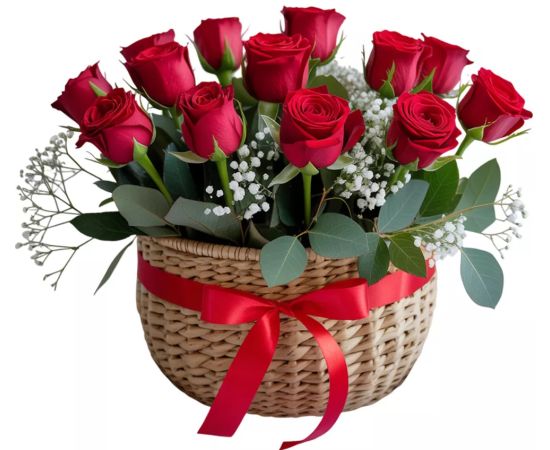 Coșul cu flori „La mulți ani” cu 11 trandafiri roșii și gypsophila este un aranjament elegant și romantic, perfect pentru a transmite iubire, admirație și apreciere. Trandafirii roșii sunt simbolul clasic al pasiunii și intensității sentimentelor, iar gypsophila adaugă un efect delicat, aerat și festiv.