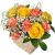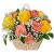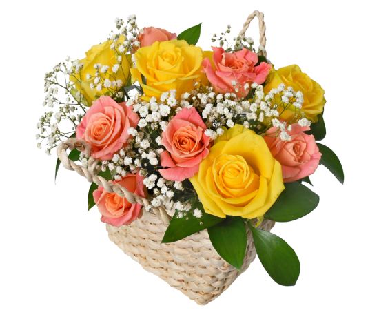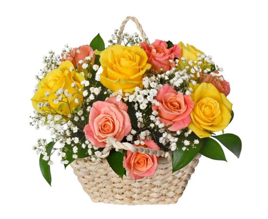 Coș cu flori – Trandafiri corali și galbeni, gypsophila și verdeață naturală