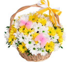 Coș cu flori – Crizanteme albe și galbene, verdeață și decorațiuni Descriere generală Un coș floral luminos și plin de vitalitate , creat din 7 ramuri de crizanteme tip mușețel în nuanțe de alb și galben , completate cu verdeață naturală și accente decorative atent alese. Fiecare...