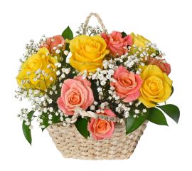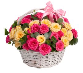 MarcaJasmine Flowers GamaCoșuri cu flori OcazieZiua de naștere, 1 și 8 Martie, Valentine's day, Paște FloriTrandafir CuloriRoz, Rosu, Galben