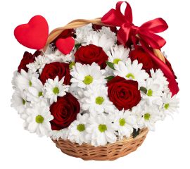 Coș cu flori – Trandafiri roșii și crizanteme albe Acest coș floral elegant îmbină pasiunea trandafirilor roșii cu puritatea delicată a crizantemelor albe tip mușețel, într-un aranjament plin de contrast și armonie. Cele 13 trandafiri roșii oferă intensitate și emoție, în timp ce...