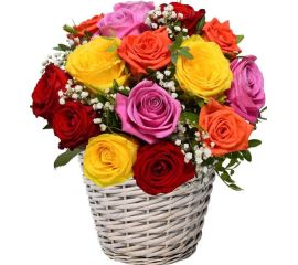 Aranjament în coș cu 15 trandafiri multicolori și Gypsophila – „Culorile Bucuriei” Un aranjament floral vibrant, realizat într-un coș elegant, care îmbină perfect eleganța trandafirilor cu delicatețea gypsophilei. Acest aranjament cu 15 trandafiri multicolori – roz, galben și roșu – și...