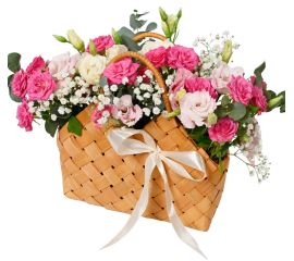 Coș cu flori – Miniroze roz, eustoma și gypsophila Un aranjament floral elegant, cu un aer romantic și proaspăt, realizat manual din miniroze roz, eustoma roz și albă, gypsophila și verdeață naturală. Toate florile sunt așezate cu grijă într-un coș decorativ ce completează perfect...