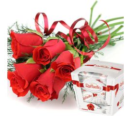 Buchet de flori „Dulceața Iubirii” cu 5 trandafiri roșii și Praline Raffaello 230g