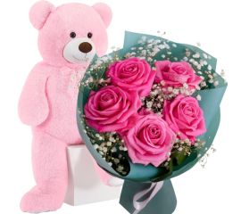 Buchet cu 5 trandafiri roz + Ursuleț de Plus 80 cm