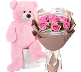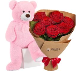 Buchet cu 7 trandafiri roz + Ursuleț de Plus 80 cm
