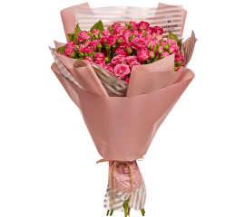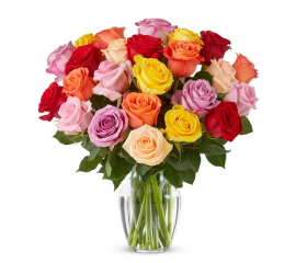 Buchet de flori cu 25 trandafiri multicolor si vaza