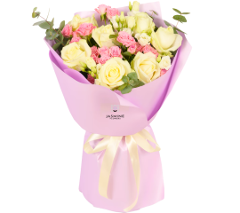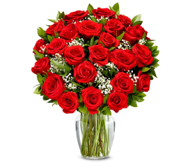 Buchet cu 25 trandafiri cu Gypsophila si vaza