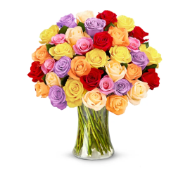 Buchet de flori cu 35 trandafiri multicolor si vaza