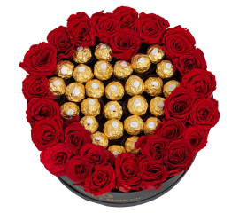 Acest aranjament floral este un cadou rafinat, perfect pentru a transmite iubire, pasiune și eleganță. Realizat într-o cutie premium, designul combină frumusețea intensă a celor 25 de trandafiri roșii cu răsfățul oferit de 30 de praline Ferrero Rocher , atent aranjate pentru un efect vizual...