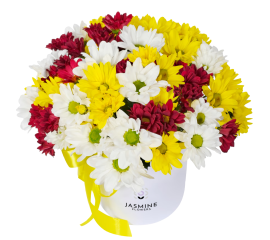 Aranjamentul floral în cutie cu 7 crizanteme – albe, roșii și galbene este o combinație armonioasă de culori care transmite echilibru, bucurie și apreciere. Crizantemele sunt flori apreciate pentru rezistența lor și pentru simbolistica pozitivă, iar mixul cromatic oferă un aspect luminos și...