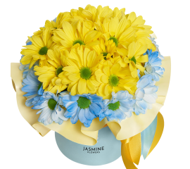 Acest aranjament floral în cutie cu crizanteme spray albe și galbene este o alegere delicată și luminoasă, perfectă pentru a transmite gânduri bune, optimism și eleganță. Combinația dintre albul pur și galbenul solar creează un contrast armonios, plin de prospețime, potrivit atât pentru ocazii...