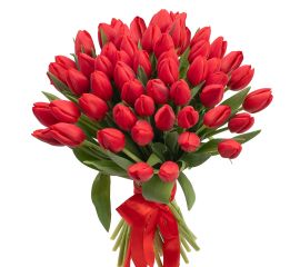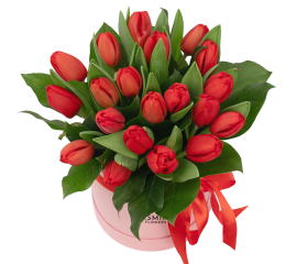 Aranjament Floral cu 19 Lalele Roșii Un aranjament floral simplu, dar extrem de elegant, realizat din 1 9 lalele roșii proaspete , așezate într-o cutie decorativă de 15 cm , cu materiale florale profesionale care mențin florile hidratate și proaspete mai mult timp. Este un cadou...