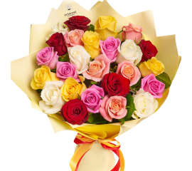 Buchet cu 25 trandafiri multicolori (alb, roz, roșu, galben) – „Zâmbetul Culorilor” Un buchet rafinat și plin de energie pozitivă, creat pentru a aduce bucurie și culoare în orice moment special. Acest buchet cu 25 trandafiri multicolori combină armonios nuanțele de alb, roz, galben și...
