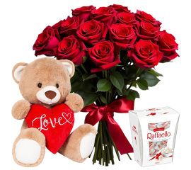 Buchet „Seară de Neuitat” cu 15 trandafiri, Praline, Ursuleț de plus